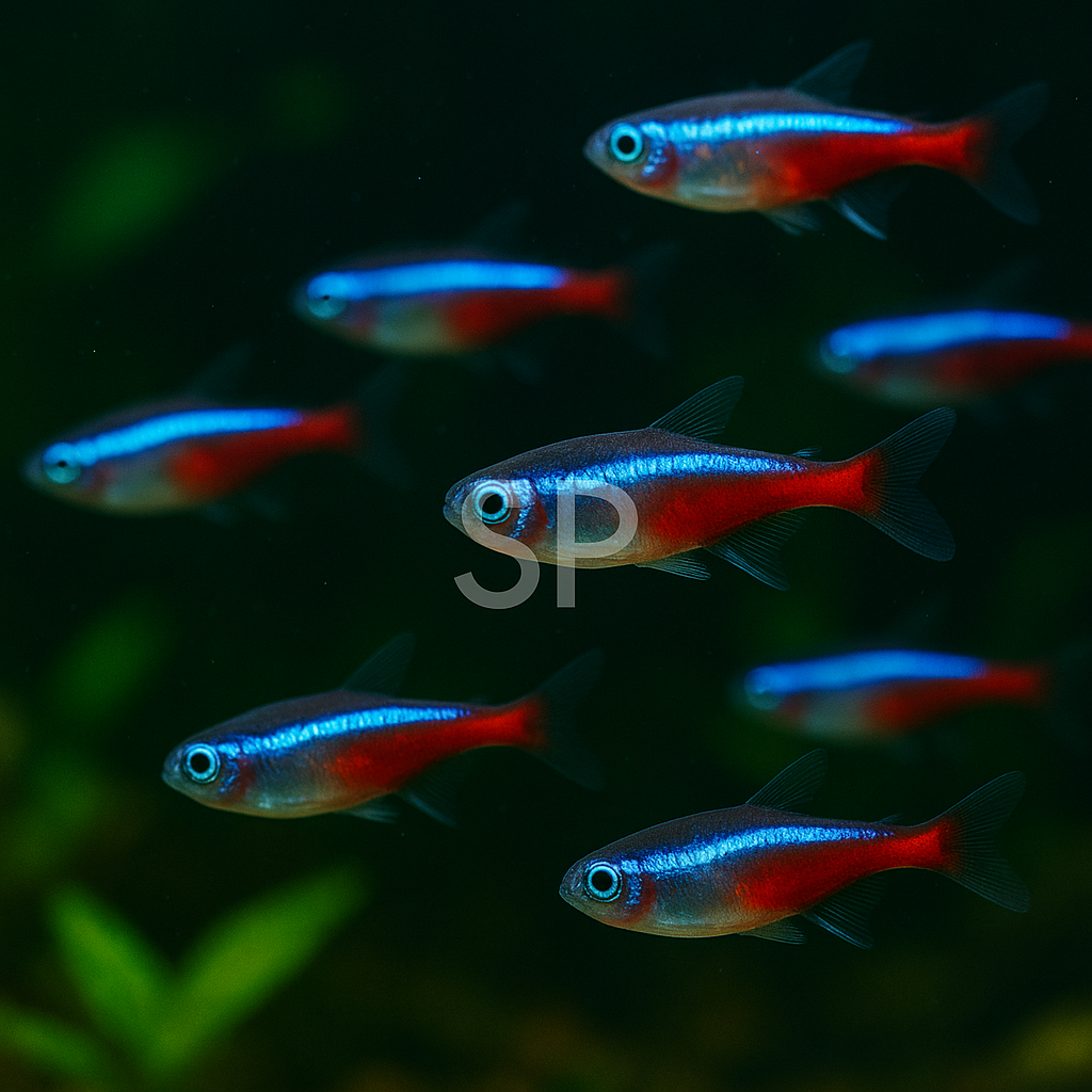 네온테트라는 몸길이가 약 3~4cm 정도로 작은 담수어입니다. 푸른 줄무늬와 붉은 꼬리 부분이 빛을 반사하면서 반짝이는 모습이 매력적이에요. 🪸